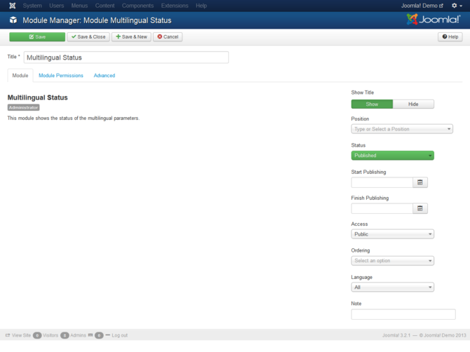 Chunk4x:Help-3x-module-administrator-multilingual-status From Joomla! Documentation Screenshot Details Title: Module must have a title Module This module shows the status of the multilingual parameters.