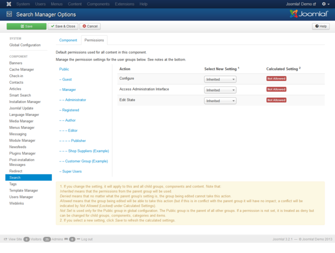 - Access Administration Interface: (Inherited/Allowed/Denied). Allow or deny Access Administration Interface for users in the Public group. Access Administration Interface Allows users in the group to access the administration interface for this extension.