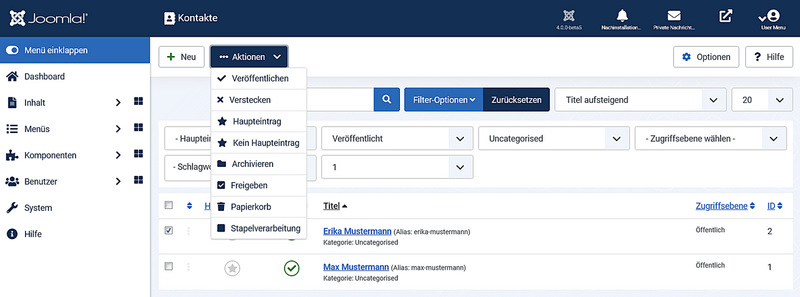 Die Kontaktliste zeigt ausgewählte Informationen für Kontakte an und bietet Links zum Bearbeiten oder Hinzufügen von Informationen wie Name, Adresse, Telefon und E-Mail. Kontakte können auch mit registrierten Benutzern verknüpft werden. Danach kann man mit der Menüverwaltung Frontend-Links zu den Kontakten erstellen.
