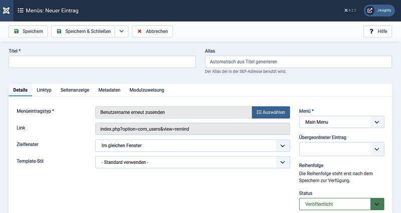 - Link. Vom System erstellter Link für den Menüeintrag. Das Feld kann nicht verändert werden, es dient ausschließlich der Information.