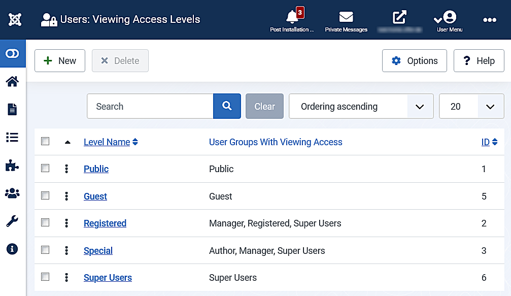 - Delete: Deletes the selected access levels. Works with one or multiple access levels selected. Note that you cannot delete an access level that is currently being used. If you try to delete an access level that is assigned, a message showing where it is assigned will be displayed.