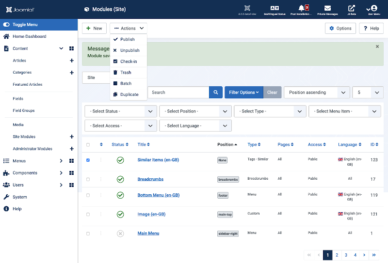 - Unpublish. Makes the selected modules unavailable to visitors to your website.
